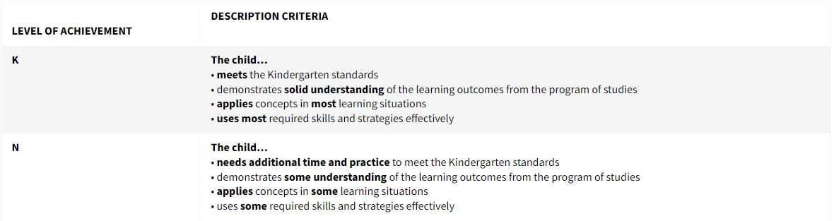 In January and June students will be assigned Levels of Achievement for the learning outcomes related to the Alberta Kindergarten Program of Studies.
